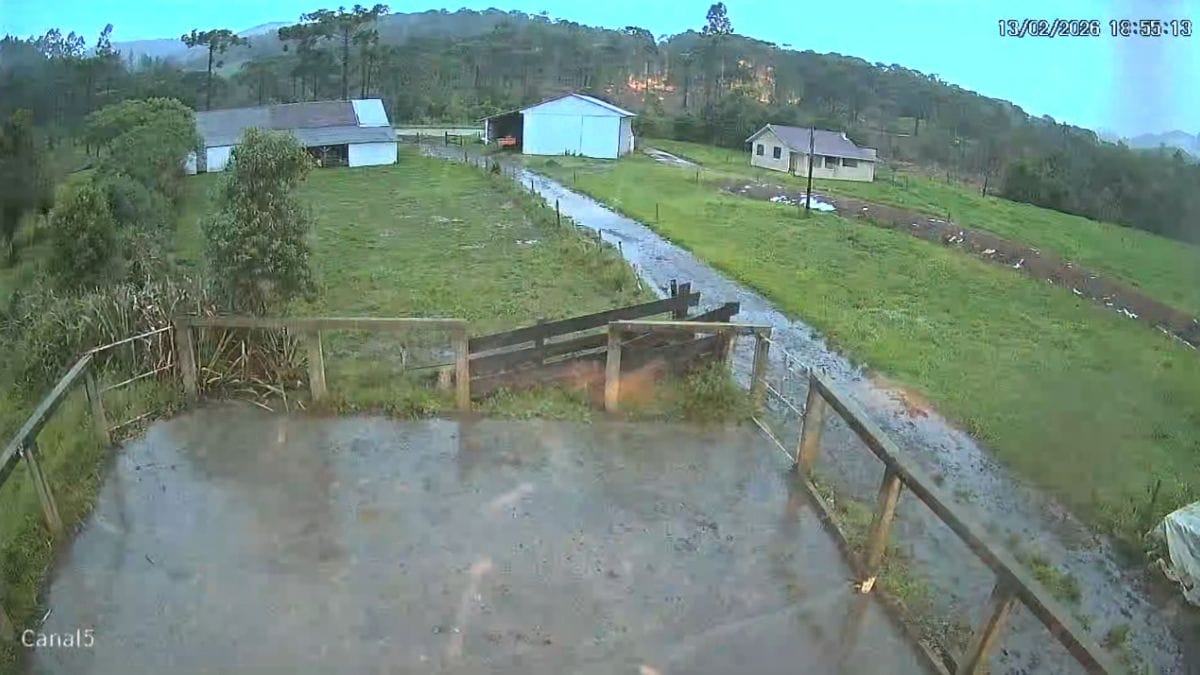 A câmera de segurança de uma propriedade vizinha flagrou o momento em que o raio atingiu uma cerca elétrica, que imediatamente começou a pegar fogo. O caso aconteceu por volta das 19h e chovia fraco no momento.